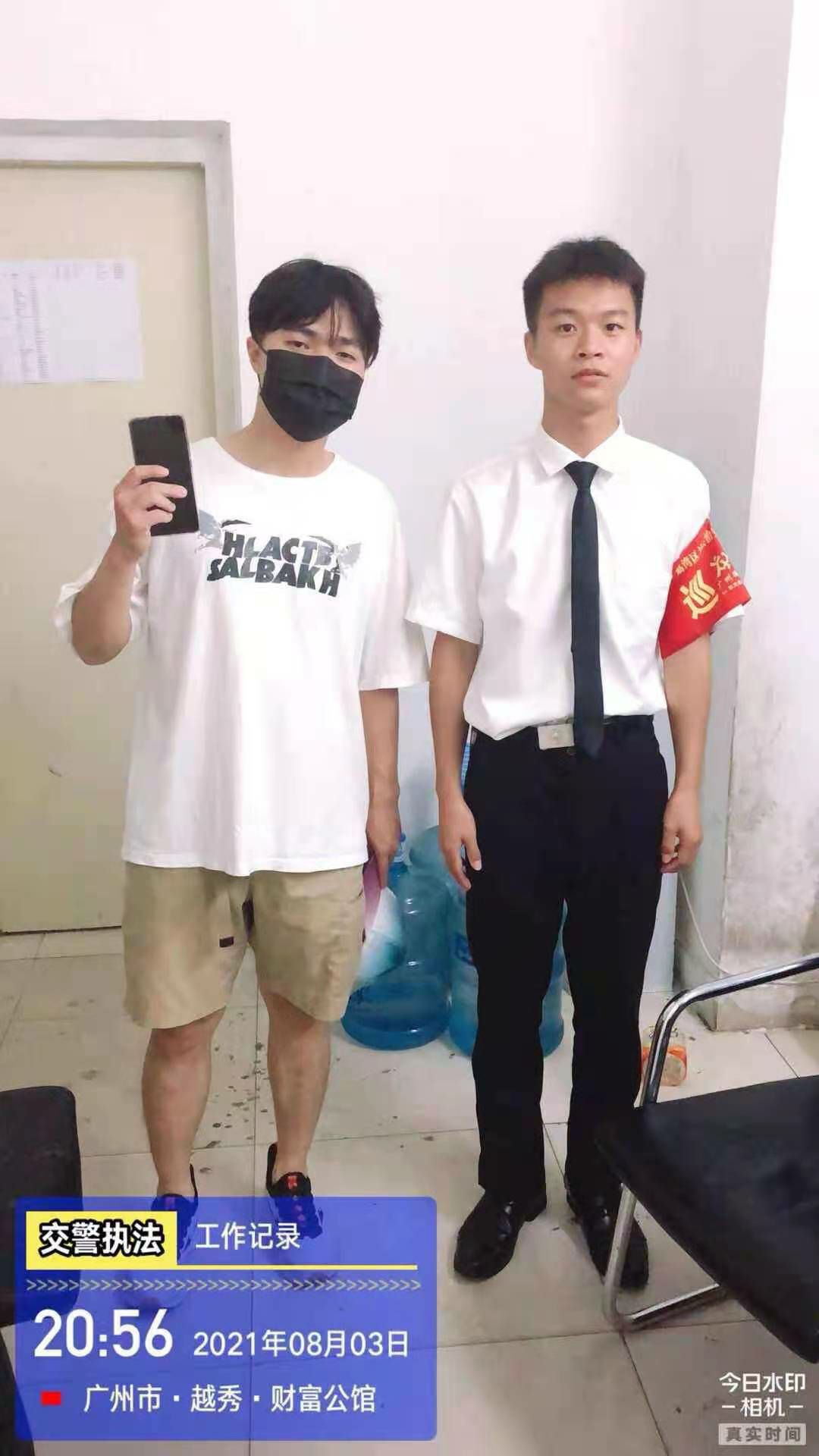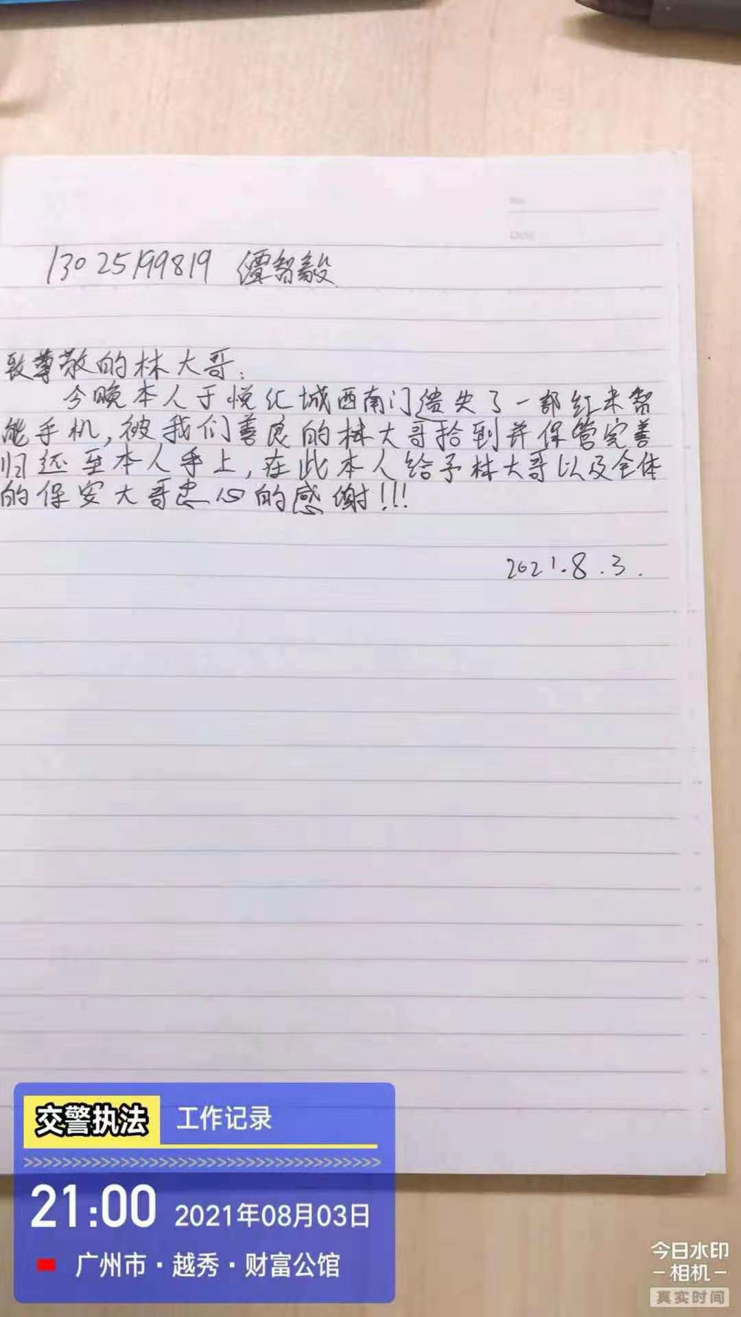 2021年8月3日,南宁夏宇企业信息管理有限公司驻西村悦汇城保安员林伟强像往常一样准备交接岗,当走至负一西南门门口的时候发现地上有一部黑色智能手机,林伟强在现场等待失主并上报了当班值班经理,不一会儿失主打电话过来,核实了失主身份后将失物归还。失主十分感动,并现场手写感谢信一封以表谢意。